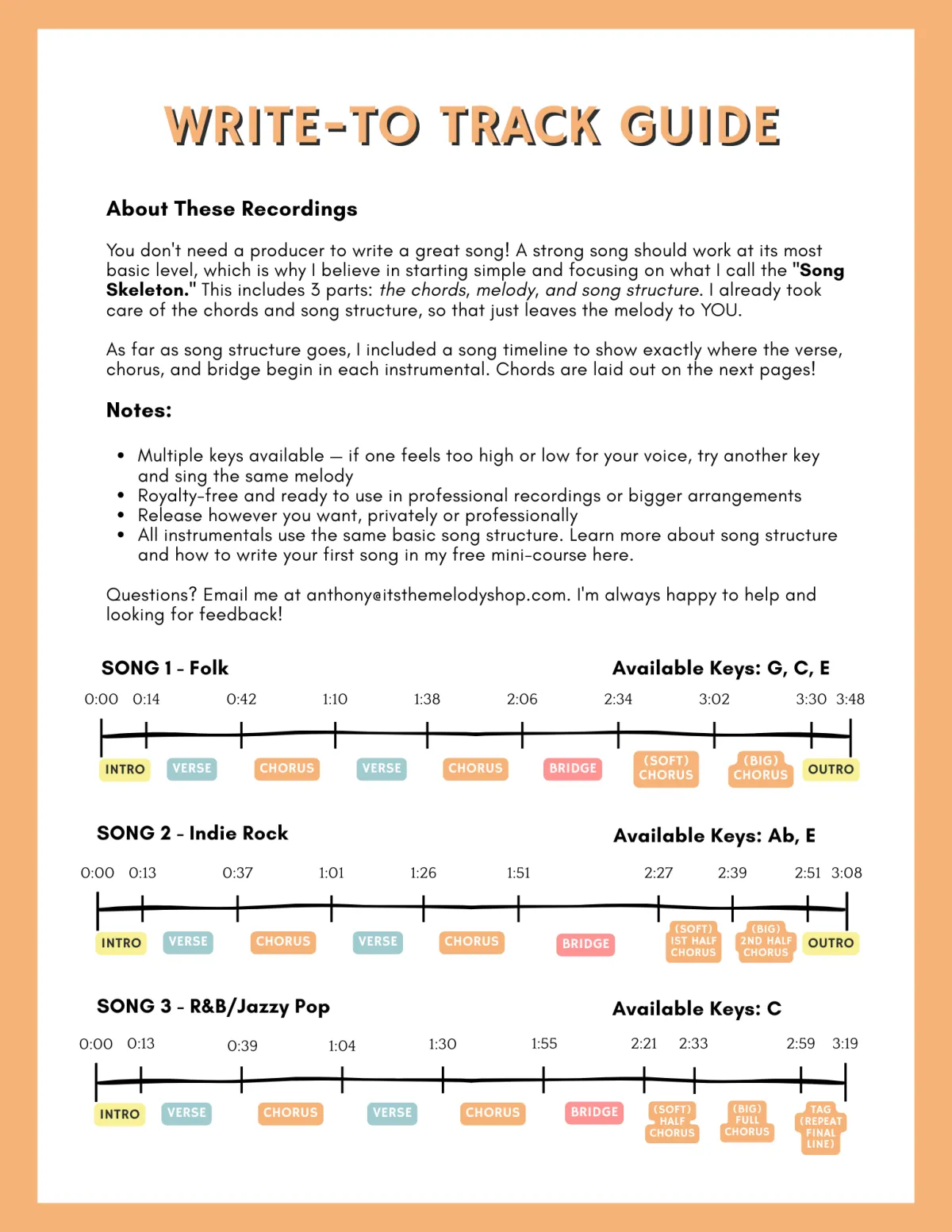 In addition, I made a track-guide PDF which maps out each track so you know exactly which section of the song you're working on just by looking at the timeline. It's like having a co-writer to work with!