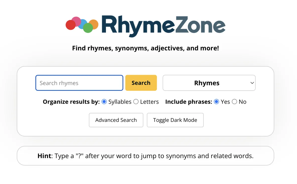 This one has been invaluable to me in my songwriting. Sometimes I'll find a rhyme that completely alters where the song goes, which can be super exciting. It also has a near-rhyme feature which mimics real life language better than other rhyme thesauruses or Chat GPT suggestions. This opens up a wide range of rhyming possibilities and connections.